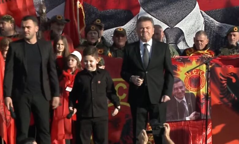 Ilir Shaqiri interpreton “Jam Shqiptar” me djalin dhe nipin në protestën në Shkup