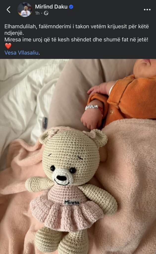 Lajmin e ka bërë të ditur vetë sulmuesi përmes një postimi emocionues në profilin e tij në Facebook. Ai ka ndarë një foto të vogëlushes, ku krah saj shihet një arush pelushi me emrin e veçantë që çifti ka zgjedhur për vajzën e tyre: Miresa.