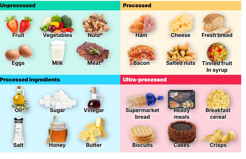 * **Ushqimet ultra të përpunuara** janë produkte industriale me shumë hapa përpunimi dhe përbërës që zakonisht nuk përdoren në gatimin shtëpiak, si emulsifikues, aromatizues, ngjyrues dhe konservues.